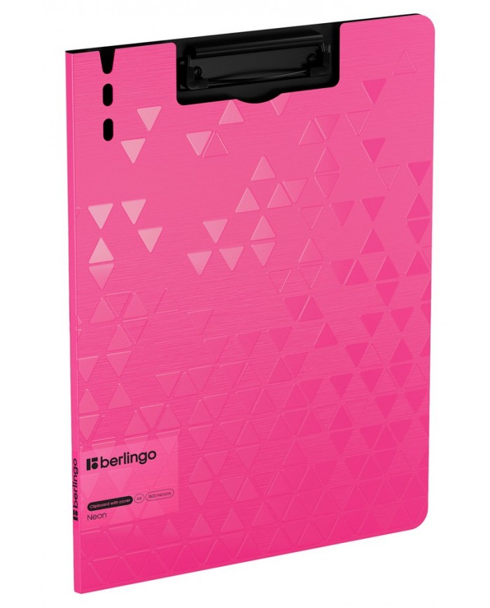 Папка–планшет с зажимом Berlingo серии Neon размером 320*225 мм изготовлена из плотного пластика (полифом) толщиной 1,8 мм. Вместимость папки – 100 листов, ширина корешка – 10 мм. Яркий розовый неоновый цвет внешней стороны в сочетании с уникальной фактурой поверхности, черный цвет внутренней поверхности с прижимом. Черный металлический зажим для фиксации документов. Возможность раскрытия папки на 360 градусов. Вырубки на крышке позволяют легко закрепить ручку на папке. Позволяет делать записи на весу. Индивидуальная упаковка в пакет.