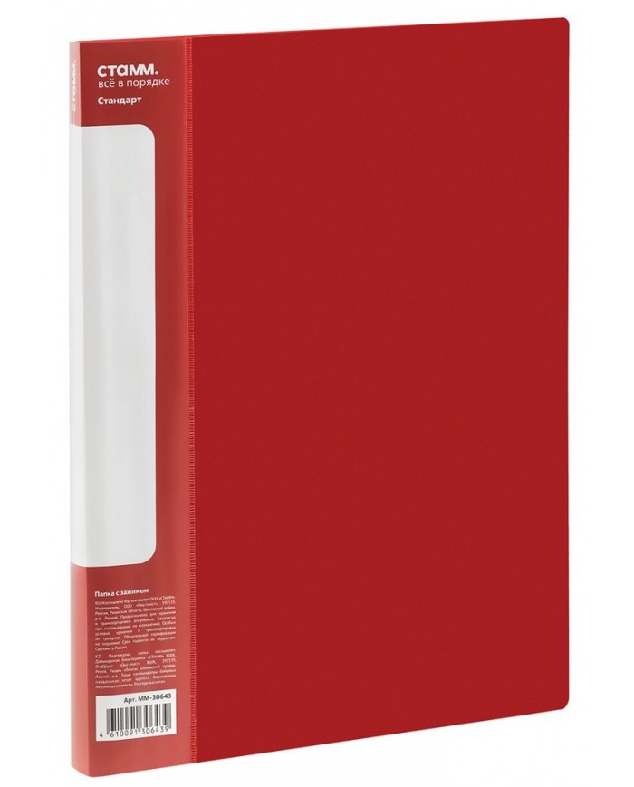Папка с боковым зажимом СТАММ "Стандарт" А4, 17мм, 700мкм, пластик, красная