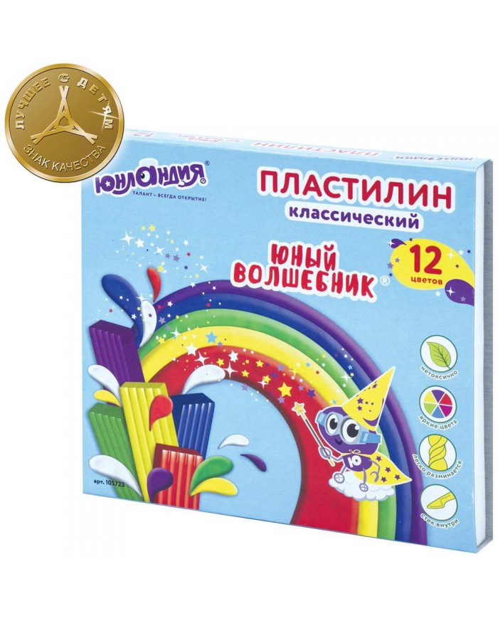 Масса набора - 240 г. В него входит 12 брусков по 20 г разных цветов. Пластилин обладает высоким качеством, прекрасными пластичными свойствами и мягкостью, легко принимает нужную форму, но не липнет к руками. Не токсичен, безопасен для детей. Стек в комплекте. Для детей старше 3-х лет.