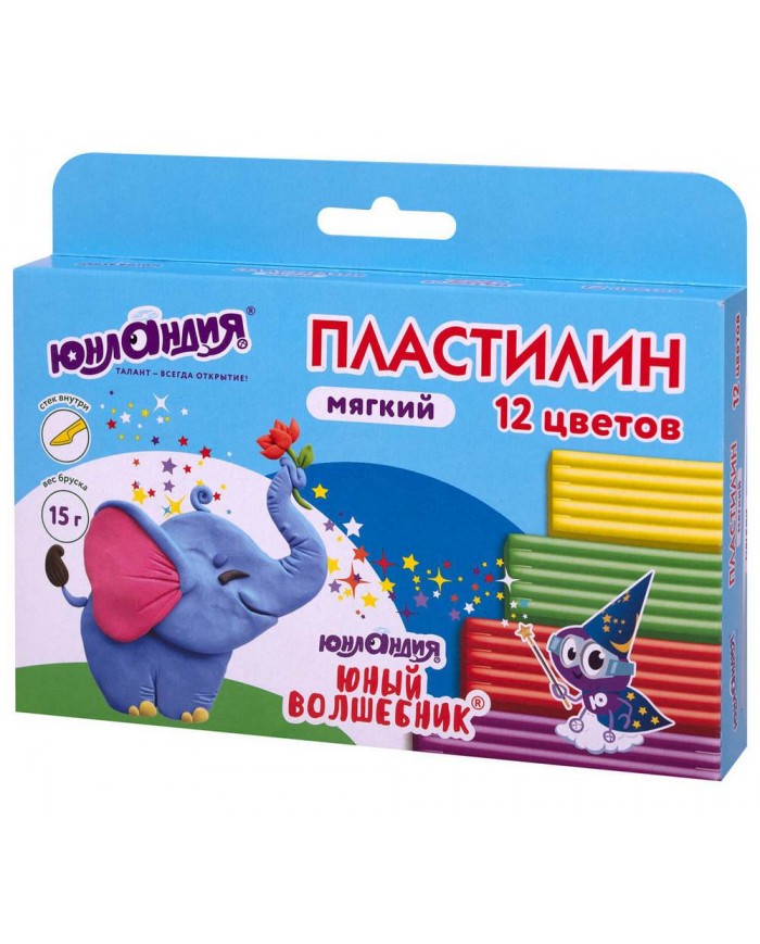 Мягкий пластилин ЮНЛАНДИЯ имеет прекрасную структуру, не требует предварительного разминания и становится эластичным от тепла детских рук. Этот пластилин имеет высокую мягкость и пластичность благодаря добавлению натурального воска. Именно поэтому даже самый маленький ребёнок (от 3х лет) без особых усилий сможет легко им пользоваться. Благодаря восковой основе и высококачественным пигментам этот пластилин имеет более яркие и насыщенные цвета по сравнению с классическим пластилином. Он не липнет к рукам, не оставляет жирных пятен, а также не прилипает к рабочей поверхности. В состав набора входят 12 цветов по 15 г различных цветов: белый, черный, синий, красный, зеленый, желтый, светло-зеленый, коричневый, голубой, оранжевый, лиловый, фиолетовый. Масса набора - 180 г. В наборе 12 ярких цветных брусков прямоугольной формы. Поставляется в комплекте со стеком.