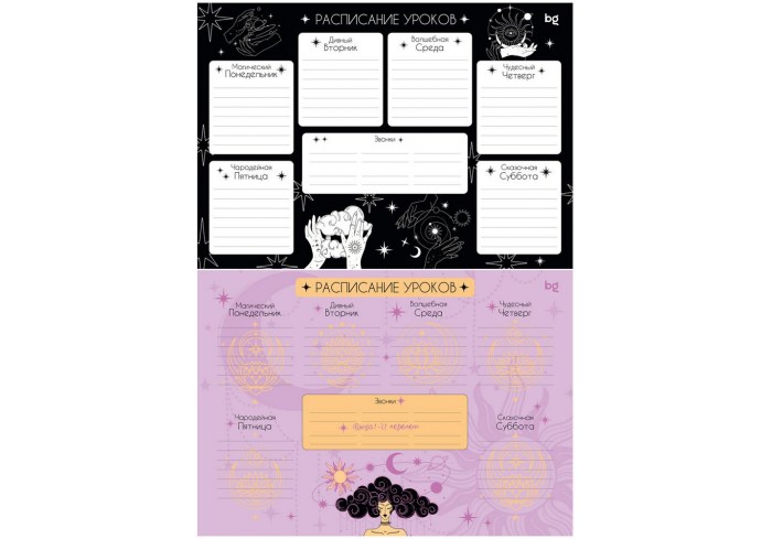 Расписание уроков BG «Предсказания» поможет школьнице придерживаться распорядка дня, рационально распределять нагрузку. Изделие формата А4 (210*290 мм..