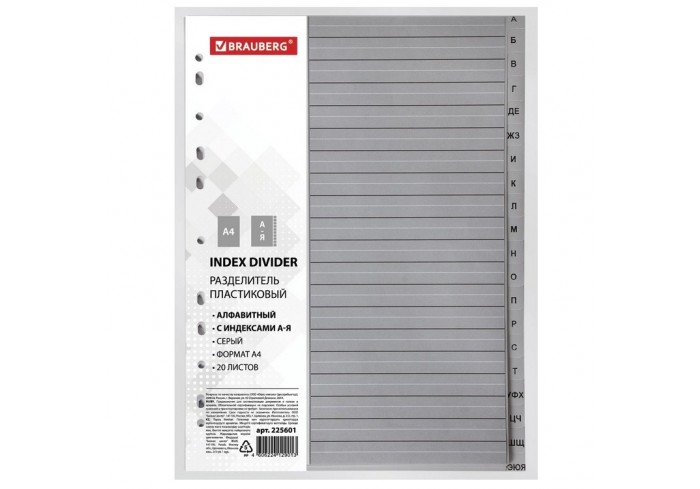 Изготовлены из пластика толщиной 0,12 мм. В комплект входят 20 листов серого цвета, обеспечивающих возможность сортировки документов по алфавиту, а та..