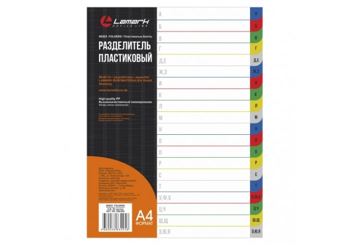 Индексные разделители Lamark (от А до Я) формата А4 из плотного цветного пластика 0,14 мм с униерсальной боковой перфорацией предназначены для классиф..