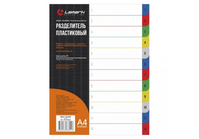 Индексные разделители Lamark (1-12) формата А4 из плотного цветного пластика 0,14 мм с униерсальной боковой перфорацией предназначены для классификаци..