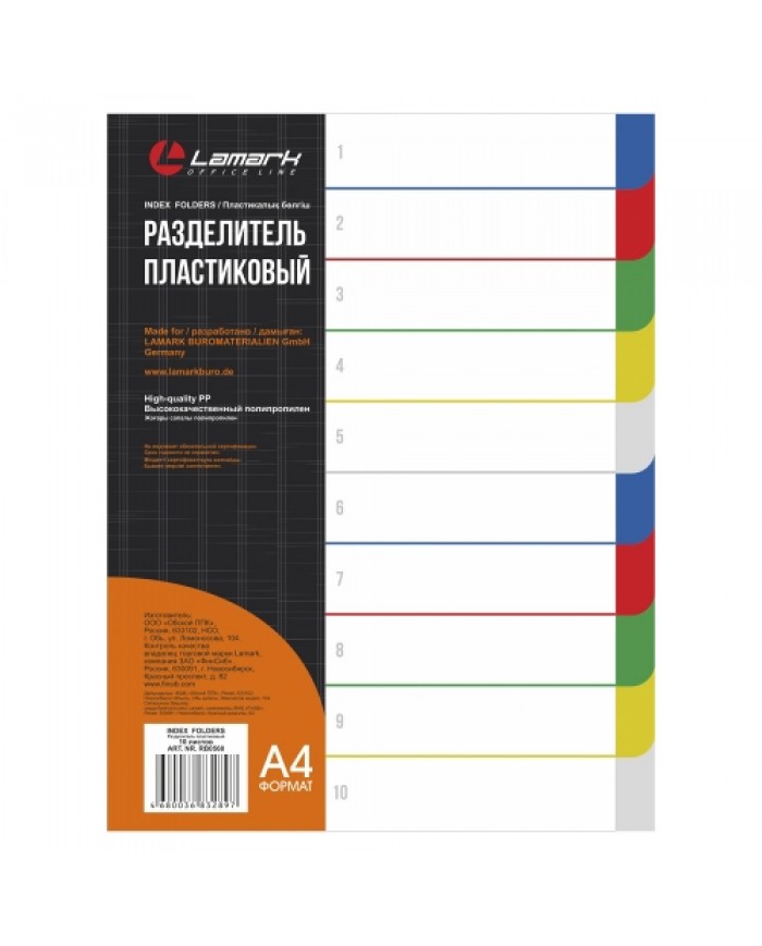 Индексные разделители Lamark формата А4 из плотного цветного пластика 0,14 мм с универсальной боковой перфорацией предназначены для классификации и систематизации документов, 10 листов. Высококачественный полипропилен (РР). Титульный лист с полем для записи в комплекте.