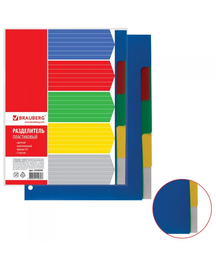 Разделитель пластиковый БОЛЬШОЙ ФОРМАТ (420х311мм), А3, 5л, оглавл, по цветам,ВЕРТИК,BRAUBERG