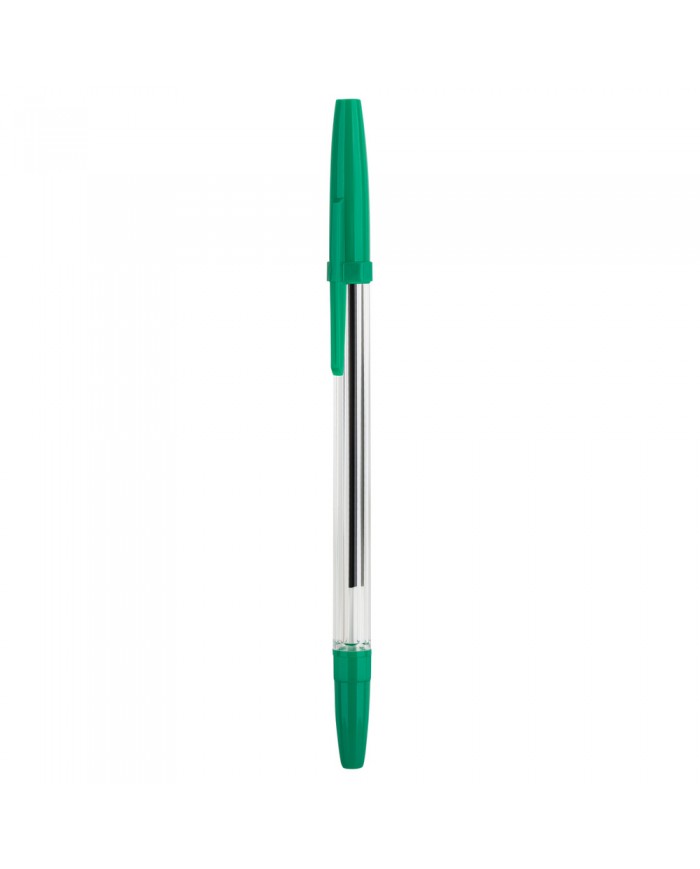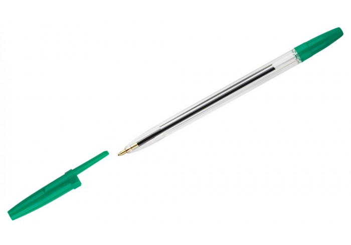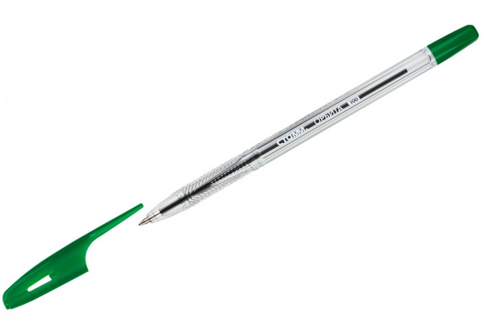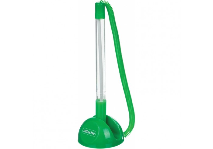 Шариковая ручка на подставке с синим цветом чернил. Модель представлена в пластиковом прозрачном корпусе с элементами зеленого цвета. Изделие прикрепл..