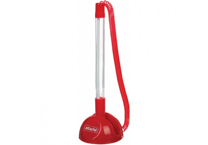Шариковая ручка на подставке с синим цветом чернил. Модель представлена в пластиковом прозрачном корпусе с элементами красного цвета. Изделие прикрепл..