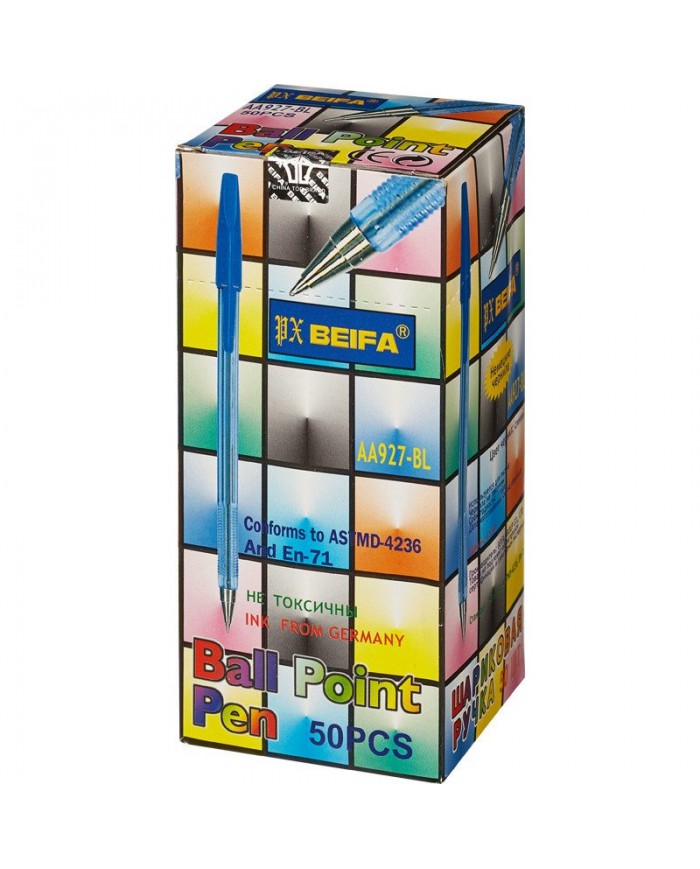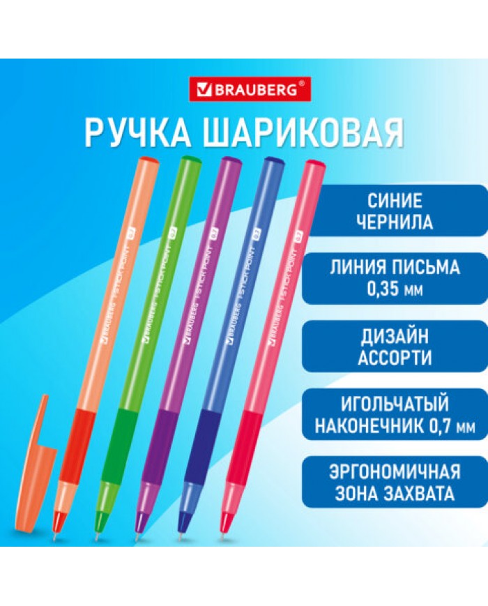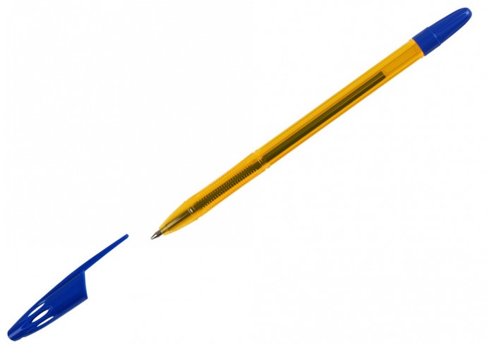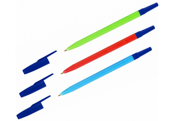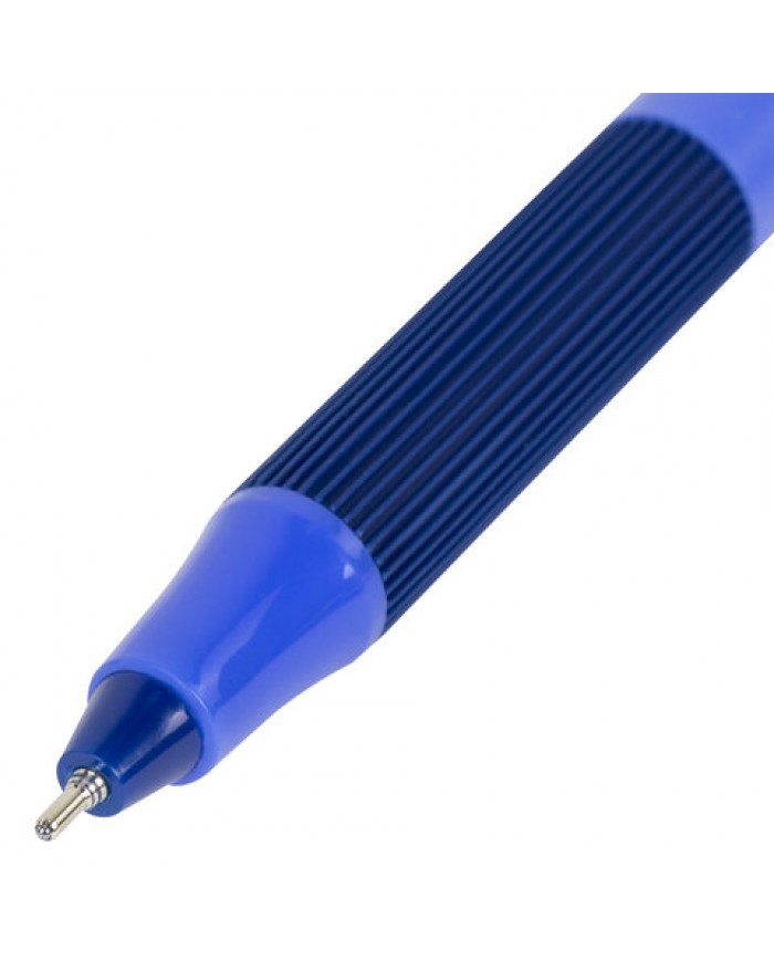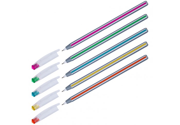 Шариковая ручка с синими чернилами на масляной основе и трехгранным корпусом ассорти. Специальные чернила пониженной вязкости и пишущий узел 0,6 мм об..