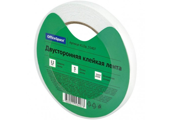 Двусторонняя клейкая лента OfficeSpace шириной 12 мм и плотностью 1000 мкм на вспененной основе является идеальным средством для быстрого и надежного ..