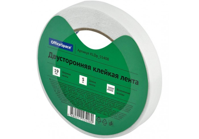 Двусторонняя клейкая лента OfficeSpace шириной 19 мм и плотностью 1000 мкм на вспененной основе является идеальным средством для быстрого и надежного ..