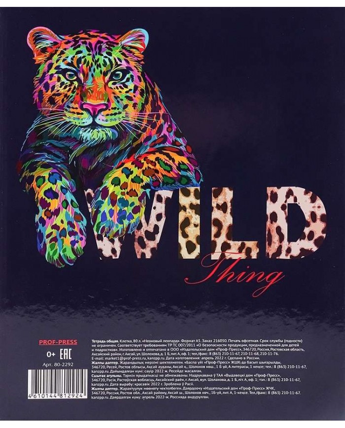 Внутренний блок содержит 80 листов офсетной бумаги плотностью 60 г/м2. Обложка изготовлена из мелованного картона. Линовка - клетка с полями. Скоба на..