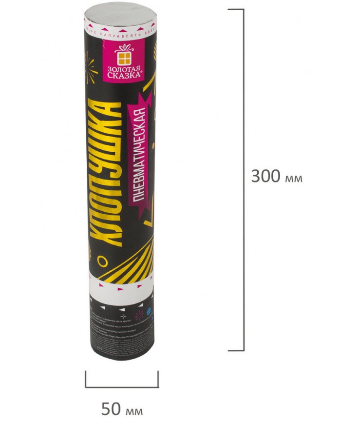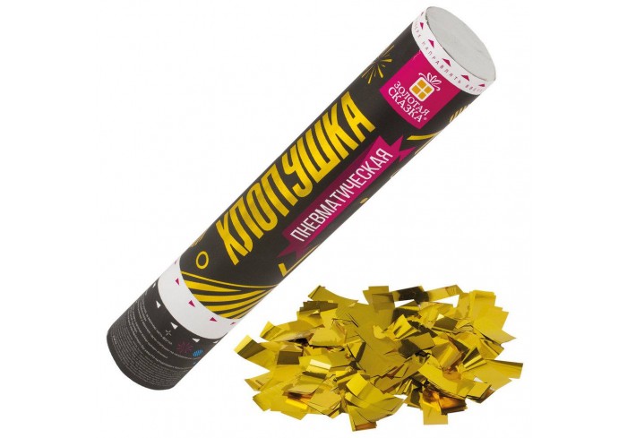 Хлопушка высотой 30 см с фольгированным наполнителем в виде прямоугольников золотого цвета является абсолютно безопасной. Выстрел осуществляется под д..