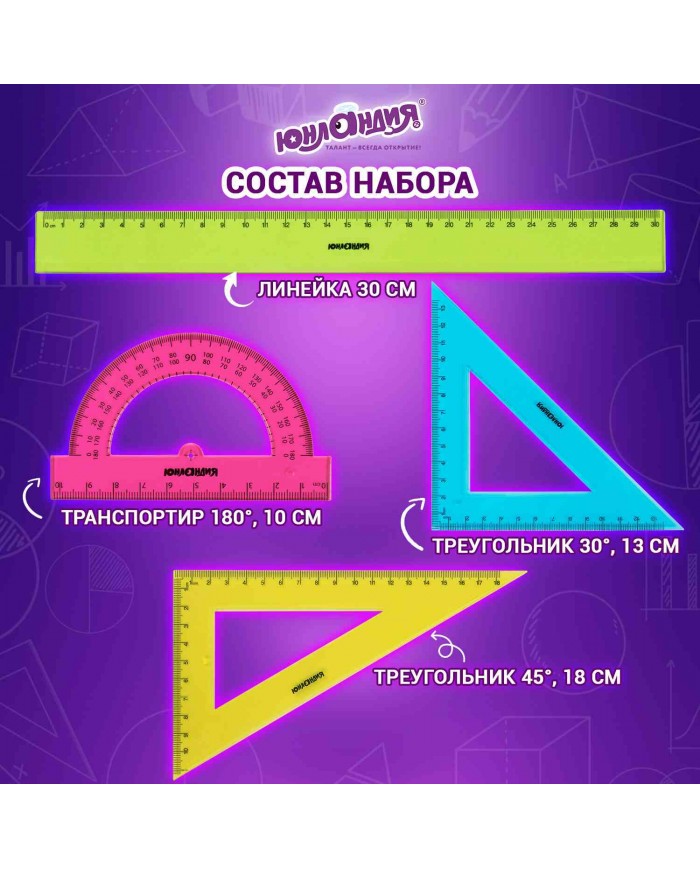 В набор входят: - линейка со шкалой 30 см; - треугольник с углом 30° и шкалой 13 см; - треугольник с углом 45° и шкалой 18 см; - транспортир 180° и шкалой 10 см. Изготовлен из прочного цветного пластика. Поставляется в пакете с европодвесом.