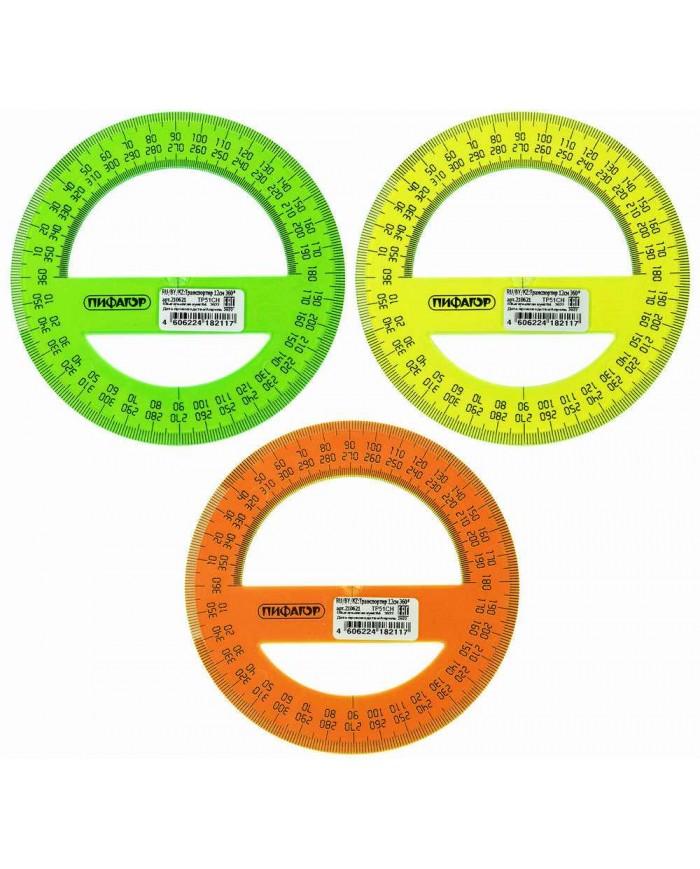Транспортир 12 см, 360 градусов, ПИФАГОР, прозрачный, неоновый, ассорти,