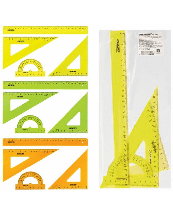 Набор чертежный большой ПИФАГОР (линейка 30 см, 2 треугольника, транспортир), прозрачный, неоновый,