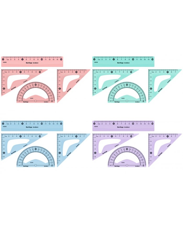Эргономичный дизайн позволяет избежать смазанных линий при черчении. Безопасные округлые края и качественная градуировка, выполненная с использованием УФ-чернил для наилучшей устойчивости, обеспечивают комфортное использование набора. Предусмотрено специальное место для указания имени.