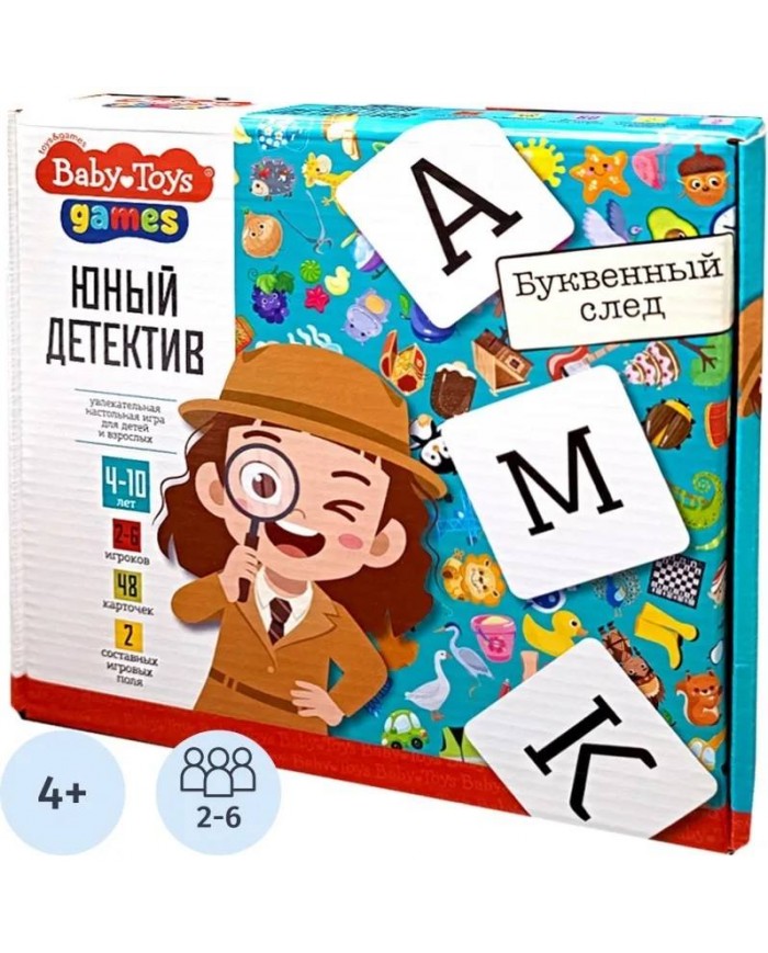 Настольная игра Десятое королевство Юный детектив Буквенный след "Юный детектив. Буквенный след" - увлекательная настольная игра для 2-6 игроков в возрасте от 4 лет, которая помогает развивать внимательность, скорость реакции и знание букв. Игровой процесс построен на поиске изображений на поле, названия которых начинаются на указанную букву. Перед началом игры игроки соединяют части игрового поля в квадрат с углами красного цвета, перемешивают карточки и выкладывают их рубашкой вверх. Каждый участник получает 10 фишек одного цвета. Первый игрок берёт карту с буквой, кладёт её в центр поля и переворачивает песочные часы. Все участники начинают искать изображения, соответствующие букве, и первым закрывают их своими фишками. Когда время истекает, ход передаётся следующему игроку. Игра завершается, когда один из участников выкладывает все 10 фишек или заканчиваются карточки. Побеждает тот, кто сумел выставить больше фишек. В комплект входят 4 двухсторонних игровых поля (размер 19x19 см), 48 карточек с буквами (размер 6.5x6.5 см), 60 жетонов (диаметр 1.6 см) и песочные часы. Упаковка имеет размер 90x22x90 мм, а вес набора - 106 г. Состав набора: - Двухсторонние игровые поля из картона - 4 шт.; - Игровые карточки с буквами - 48 шт.; - Жетоны из плотного картона - 60 шт.; - Песочные часы.