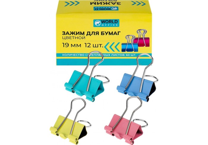 Зажимы для бумаг цветные НЕОН. Размер 19 мм. 12 штук в цветной картонной коробке...