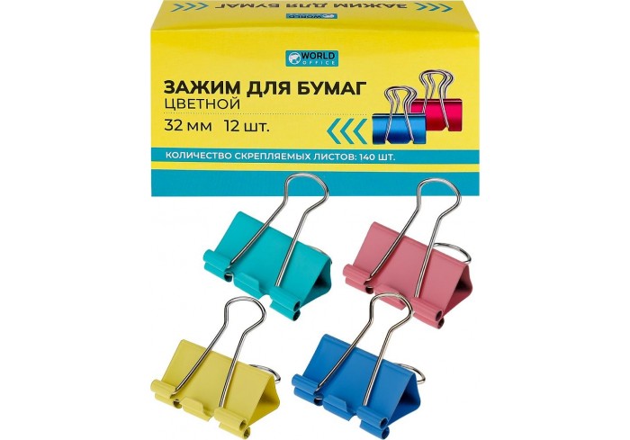 Зажимы для бумаг цветные НЕОН. Размер 32 мм. 12 штук в цветной картонной коробке...