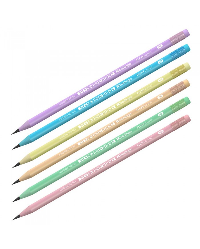 Чернографитный ударопрочный пластиковый карандаш Berlingo "Flexy Pastel" с цветным материалом копруса, с заточкой и ластиком. Стильный корпус в пастельных тонах в сочетании с цветным пластиком в тон корпуса карандаша и белым лого. Не ломается при падении. Безопасен для детей, в случае разлома, не оставляет мелких и острых фрагментов. Подходит для черчения и рисования. Диаметр грифеля 2 мм, твердость HB, трехгранная форма, штрих-код на корпусе.