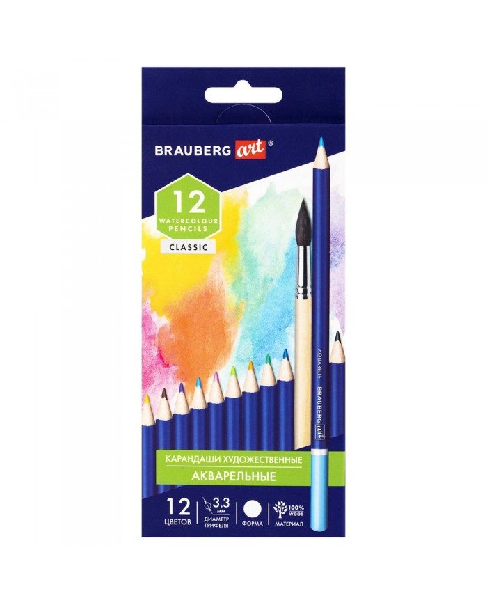 Карандаши художественные цветные акварельные BRAUBERG ART CLASSIC, 12 цветов, грифель 3,3 мм