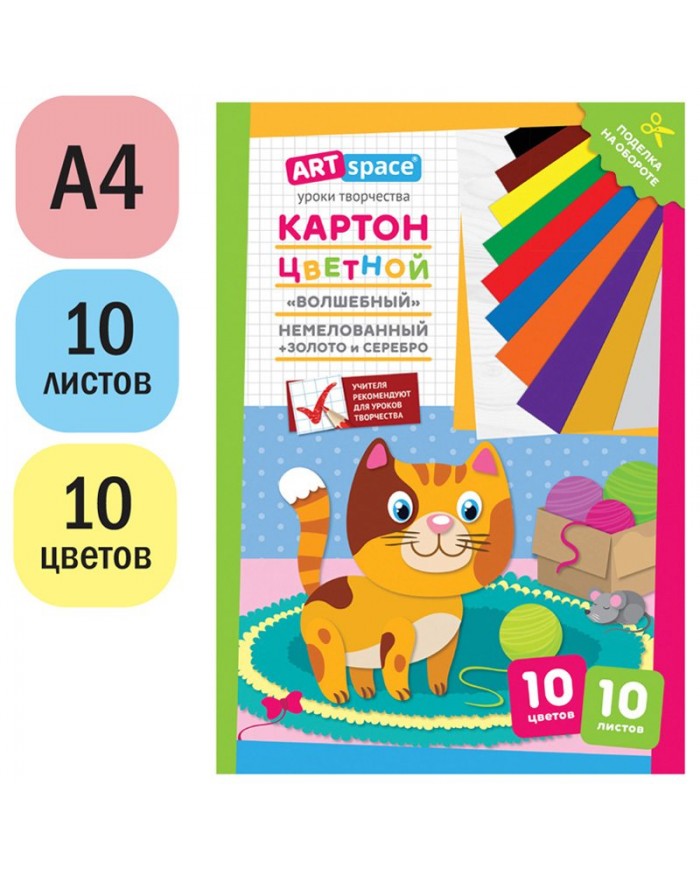 Картон цветной А4, ArtSpace, 10л., 10цв., немелованный, золото, серебро, в папке, "Волшебный. Котено