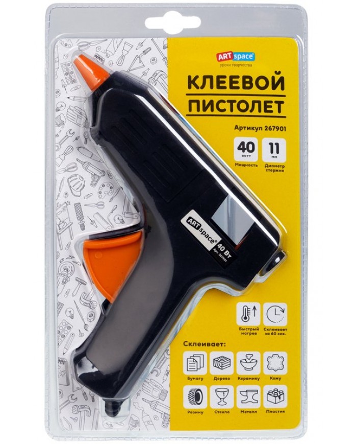 Пистолет клеевой 40 Вт большой (в блистере) предназначен для прочной фиксации поверхностей с помощью расплавленной клеевой массы. Заправляется он специальным клеевым стержнем диаметром 11 мм. Корпус клеевого пистолета изготовлен из ударопрочной пластмассы и имеет скобу для надежной установки в нерабочем положении. Принцип работы: клеевый стержень плавится в металлической камере с помощью нагревательного устройства и для точного дозирования при нажатии на курок подаётся из сопла на склеиваемую поверхность. Мощность пистолета в 40 Вт позволяет очень быстро разогреть клеевой стержень и получать удовольствие от быстрой и бесперебойной работы. С его помощью вы сможете склеить: дерево, пластик, резину, кожу, стекло, металлы (их лучше перед работой разогревать феном), ткань, пенопласт, керамику, картон, бумагу, цветы или что-то другое. Используется как в домашних условиях, так и на производстве: для монтажа электрических плат, декорирования, изготовления упаковочной и сувенирной продукции, при прокладке кабеля сетей фиксированной телефонной связи и сетей передачи данных, при производстве багетов и картинных рам. Клеевой стержень в комплекте. Два клеевых стержня в комплекте.