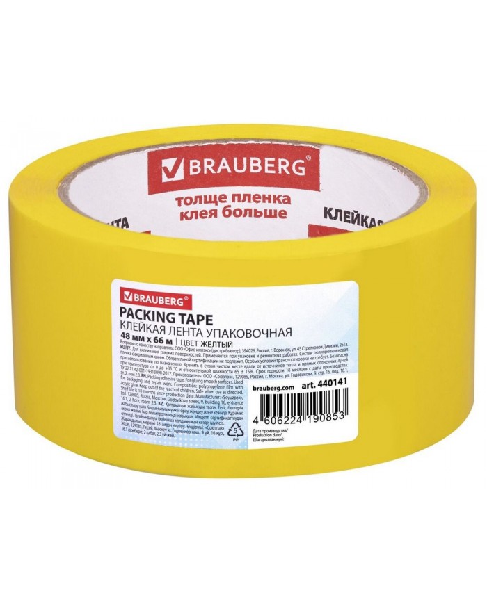 Клейкая лента упаковочная, 48 мм х 66 м, ЖЕЛТАЯ, толщина 45 микрон, BRAUBERG,