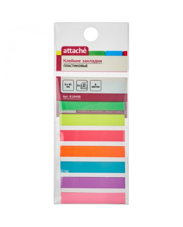 Пластиковые клейкие закладки Attache. Закладки клейкие, ширина которых составляет 8 мм, могут служить закладками в документах, использоваться для записи краткой информации, для выделения текста. Яркие неоновые цвета закладок акцентируют Ваше внимание на нужном моменте в документе или тексте. Прозрачный пластик, из которого они изготовлены, не скрывает при этом самого текста. Клейкие закладки легко удаляются, не оставляя следов и не повреждая бумагу. Одну закладку можно использовать несколько раз. Размер одной закладки 8x45 мм. На закладках можно писать ручкой, чернографитовым карандашом, маркером, фломастером. В упаковке 8 ярких неоновых цветов по 20 листов каждого цвета. Чтобы увеличить срок службы закладок, пожалуйста, следуйте рекомендациям: 1) Отделять закладку от блока следует вдоль клеевой полосы. Так можно избежать скручивания и последующего отклеивания закладки. 2) Прежде чем наклеивать закладку, убедитесь в отсутствии грязи и пыли на поверхности. На чистой поверхности срок службы клеевого слоя более продолжителен.