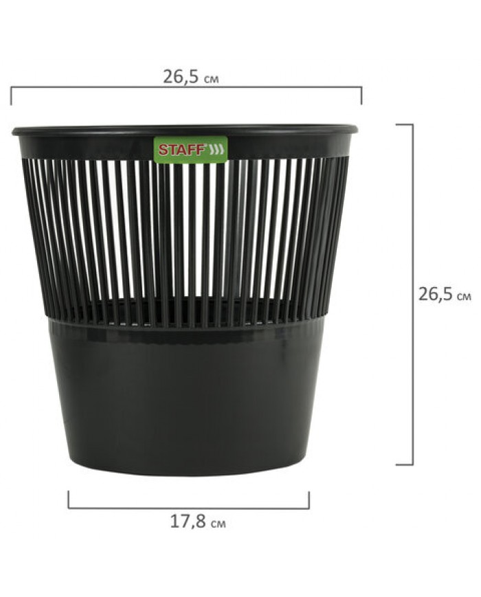 Изготовлена из вторичного пластика черного цвета. Корпус слегка расширяется кверху: диаметр основания составляет 17,8 см, а диаметр верхней части – 25,5 см. Высота – 26,5 см. Легкость и компактность корзины позволяют перемещать ее с одного места на другое. Изделие легко помещается под рабочим столом. Товар относится к сегменту "ЭКОНОМ" и имеет оптимальное соотношение цены и качества. Рекомендуемый размер мешка для мусора – 32х55 см, объем – до 12 литров.