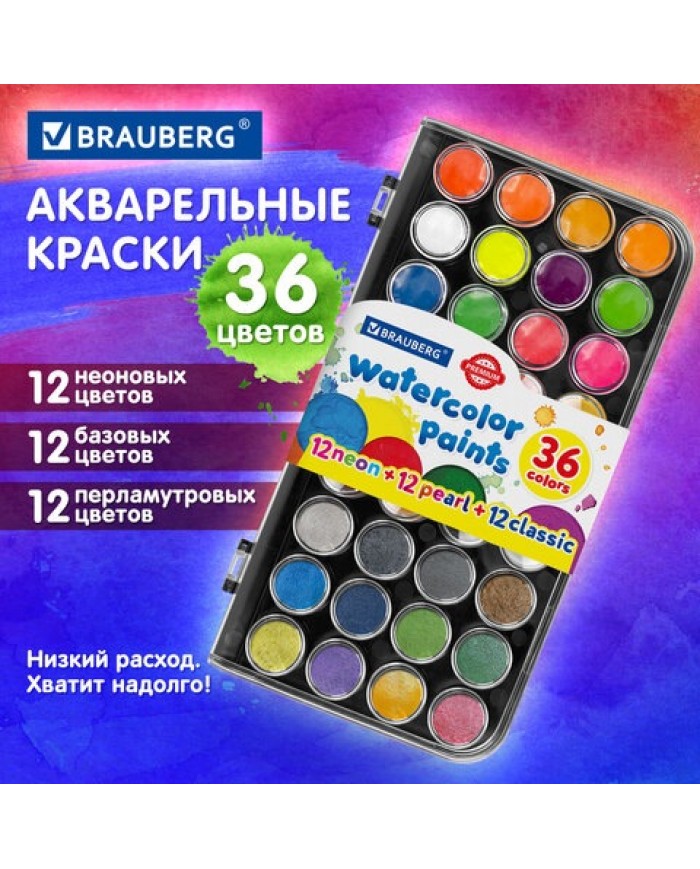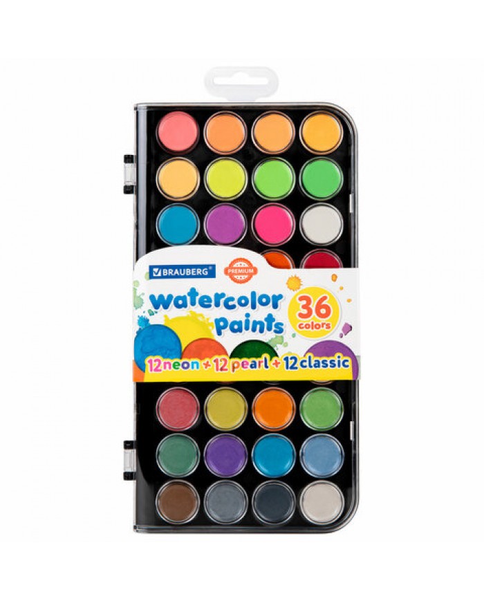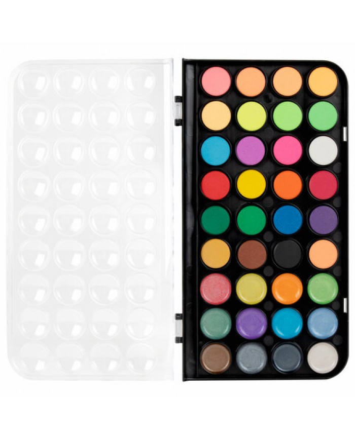 В наборе — 36 насыщенных цветов, которые отлично смешиваются, позволяя создавать множество оттенков. Помимо 12 базовых цветов, в комплект входят 12 цветов с эффектом металлик и 12 неоновых цветов. Краски легко наносятся, образуя яркое, насыщенное покрытие даже в один слой. Обеспечивают однородное окрашивание, быстро высыхают и со временем не портятся. Безопасны для детей, нетоксичны. Выпускаются в пластиковом пенале с европодвесом, прозрачной крышкой, круглыми кюветами и отделением для кисточки. Съёмную пластиковую крышку можно использовать в качестве палитры для смешивания красок.