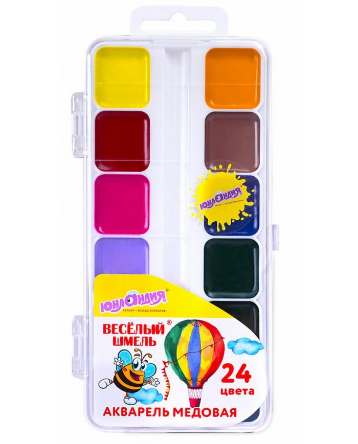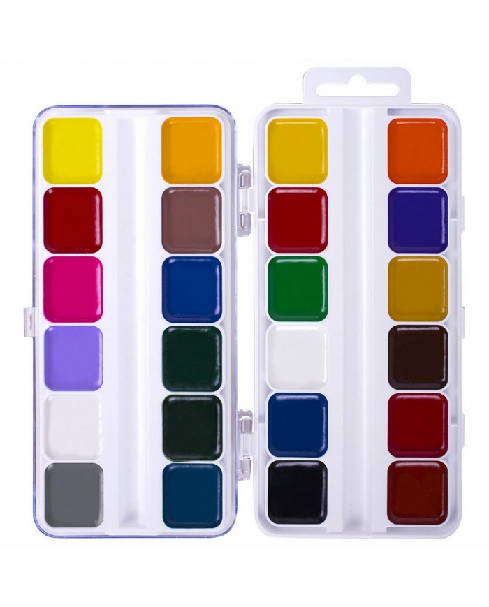 24 ярких насыщенных цвета отлично смешиваются между собой и позволяют создать множество оттенков, обеспечивают однородное окрашивание. Краски быстро высыхают и не портятся со временем. Безопасны для детей, нетоксичны. Выпускаются в пластиковом пенале с прозрачной крышкой, квадратной формой кювет и отделением для кисточки. Упаковка обладает компактными размерами и легким весом.