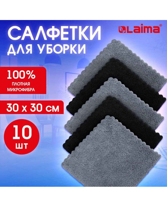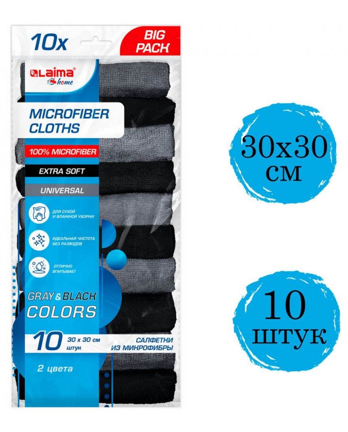 Салфетки из МИКРОФИБРЫ 30х30 см, GRAY BLACK, big pack, КОМПЛЕКТ 10 штук, 180 г/м2, LAIMA HOME,