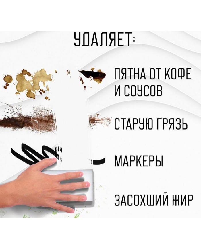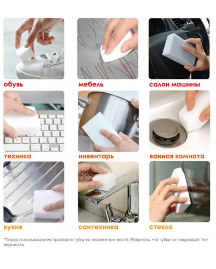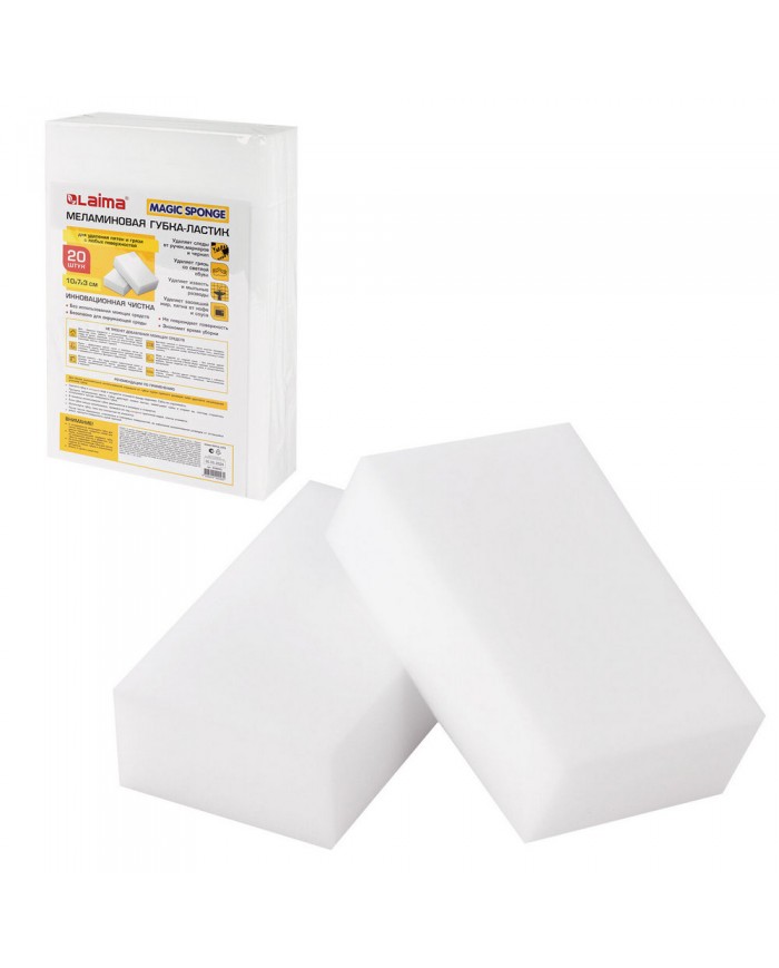 Губка состоит из 100% вспененного меламина (моющего вещества). Можно использовать как ластик, который удаляет застарелые загрязнения различного рода с кафеля, обуви, пластика, кожи и других поверхностей. Другие моющие средства вместе с ней не применяются – меламиновая губка сама является моющим средством при взаимодействии с водой. Перед применением необходимо поместить меламиновую губку в емкость с холодной водой, аккуратно отжать между ладонями, чтобы меланин вступил в реакцию. Скручивать нежелательно (может нарушится целостность губки). Рекомендуем пользоваться перчатками. Беречь от детей и домашних животных. Меламин – это полимерный материал, из которого делают множество вещей: клеи, лаки, пенопласты и, в том числе, меламиновые губки – губки-ластики, которые используются в быту для очищения посуды и мебели от пятен различного происхождения. Как это часто бывает при появлении на рынке новых продуктов, возникает обеспокоенность по поводу безопасности меламина, но в отношении него было проведено множество исследований, которые говорят о том, что меламин не более токсичен, чем обычная кухонная соль. Меламиновая губка внешне напоминает кусок светлого поролона, но по текстуре и на ощупь это совершенно другой материал, твердость можно сравнить со стеклом или наждачной бумагой, но при контакте с водой губка становится мягкой и податливой. Все дело в образовании пены. При образовании пены одна часть пор остается закрытой, а вторая – открывается. Та часть губки, которая остается открытой, обогащена множеством усиков, которые во время соответствующей работы придают свойства шершавости и цепкости. А вот закрытая часть губки имеет иные характеристики и свойства: жесткость и эластичность. Перед началом использования важно оценить визуально размер губки. Если кажется, что она по своим размерам слишком велика, то можно отрезать лишнюю часть при помощи ножниц или же острого ножа. Во время использования меламиновую губку требуется пропитать небольшим количеством воды, затем тщательно отжать, чтобы удалить все излишки влаги. Чистящее изделие способно самостоятельно справиться с различными загрязнениями, поэтому добавления жидких чистящих средств при этом можно не допускать. Очень опасно наносить на поверхность меламиновой губки любые химические реагенты, так как это спровоцирует появление негативной химической реакции. Во время использования рекомендовано чистить поверхности предметов от загрязнений кончиком меламиновой губки. Чистящее изделие имеет свойство изнашиваться, поэтому использованный кончик губки можно регулярно "затачивать" при помощи ножниц или ножа. Размер упаковки – 70х200х270 мм. Комплект – 20 штук.
