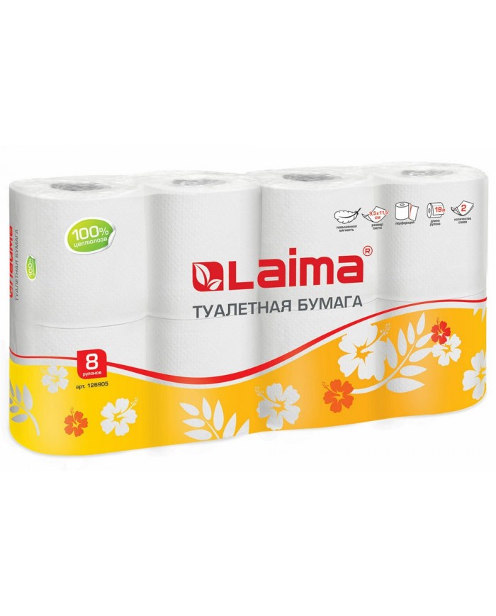 Бумага туалетная бытовая, спайка 8 шт., 2-х слойная, (8х19 м), LAIMA, белая,