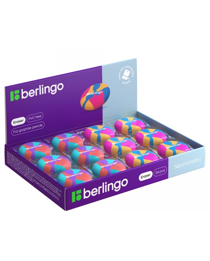 Ластик Berlingo Neonometry выполнен из термопластичной резины. Размер ? 36*36*11 мм. Не токсичен, не содержит ПВХ и фталатов. Изделие прекрасно справляется с линиями от чернографитного карандаша, не оставляет следов и грязных разводов после себя, не повреждает бумагу.