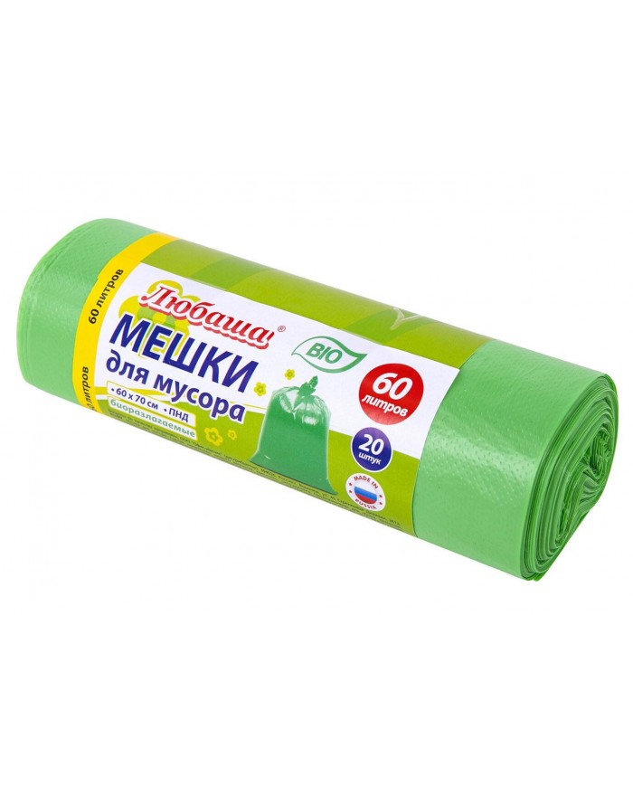 Мешки для мусора биоразлагаемые 60 л, зеленые, рулон 20 шт., ПНД 15 мкм, 60х70 см, ЛЮБАША, 608099