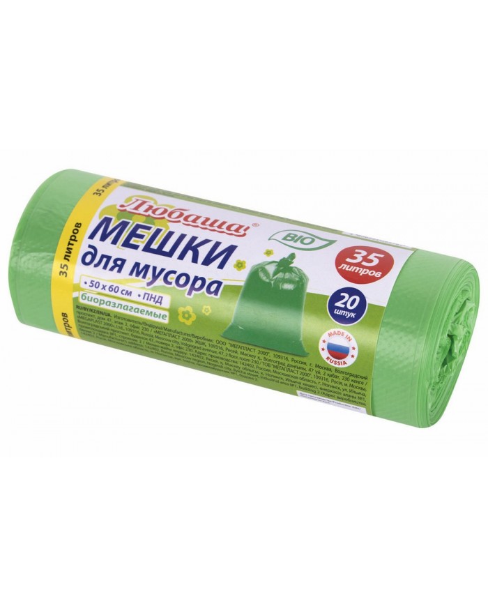 Мешки для мусора биоразлагаемые 35 л, зеленые, рулон 20 шт., ПНД 11 мкм, 50х60 см, ЛЮБАША,