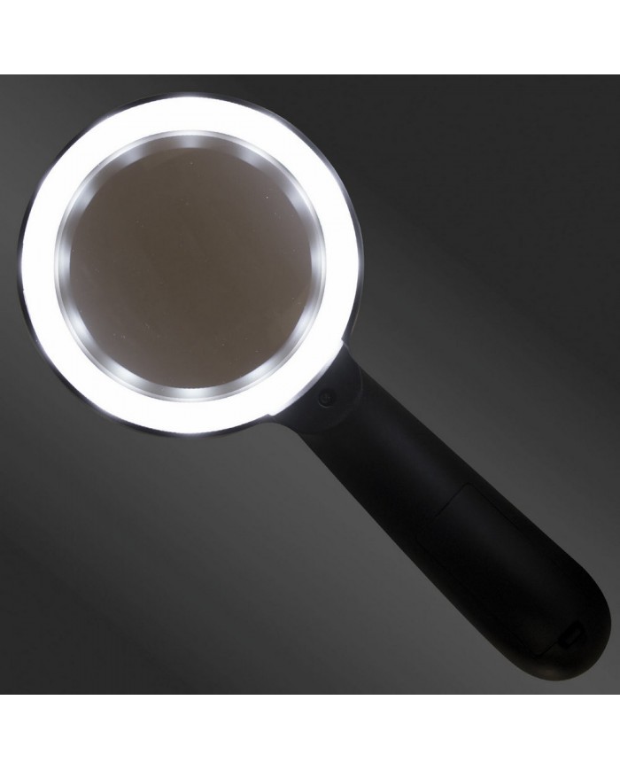 Корпус изделия изготовлен из пластика черного цвета. Увеличение линзы 10х, диаметр 90 мм. Лупа оснащена 12 светодиодными лампами, расположенными в форме кольца, обладающими ярким и мягким светом. Переключатель имеет эргономичную форму, удобен в использовании. Для питания подсветки используются 3 батарейки ААА (в комплект не входят).