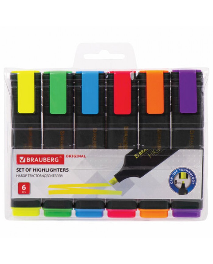 В наборе шесть неоновых цветов: желтый, зеленый, голубой, розовый, оранжевый, фиолетовый. Плоская форма корпуса, диаметр которого 25 мм. Скошенный наконечник имеет толщину линии письма от 1 до 5 мм, что обеспечивает удобство при работе с текстом, напечатанным мелким шрифтом, или таблицами. Благодаря особой водной основе чернил текстовыделители не высыхают без колпачка в течение 8 часов. Текстовыделители обладают экономным расходом чернил, при этом длина линии письма достигает 300 метров. Чернила быстро впитываются и тем самым предотвращают размазывание в процессе использования. Светоустойчивые чернила не выцветают даже на открытом солнце. Цвет клипа соответствует цвету чернил.
