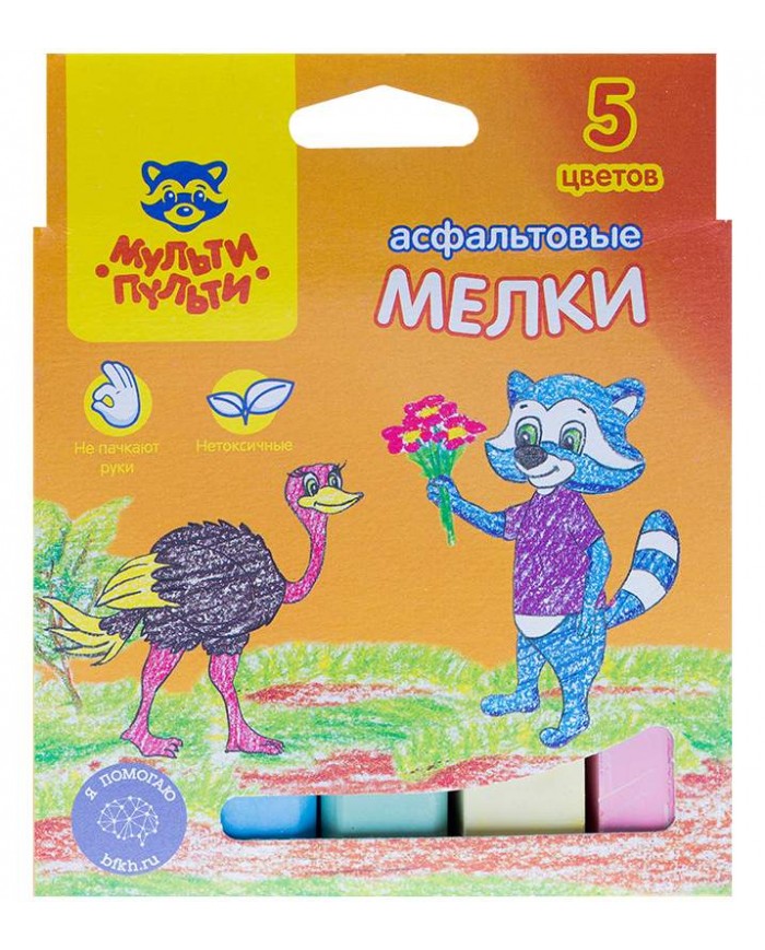 Набор из 5 квадратных мелков Мульти-Пульти «Енот в Австралии» для рисования на асфальте и любой шероховатой поверхности состоит из 5 цветов ассорти: зелёного, синего, жёлтого, красного, белого. Удобная форма и мягкое письмо. Натуральный состав на основе мела, гипса, воды и пигментов, без выраженного запаха. Мелки нетоксичные. Средняя твёрдость. Следы мелков легко счищаются с рук. Набор упакован в картонную коробку. Предназначен для детей старше 3-х лет. Большие наборы мелков оптимальны для творч