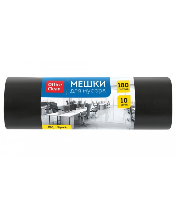 Мешки для мусора 180л OfficeClean ПВД, 90*110см, 35мкм, 10шт., черные, в рулоне