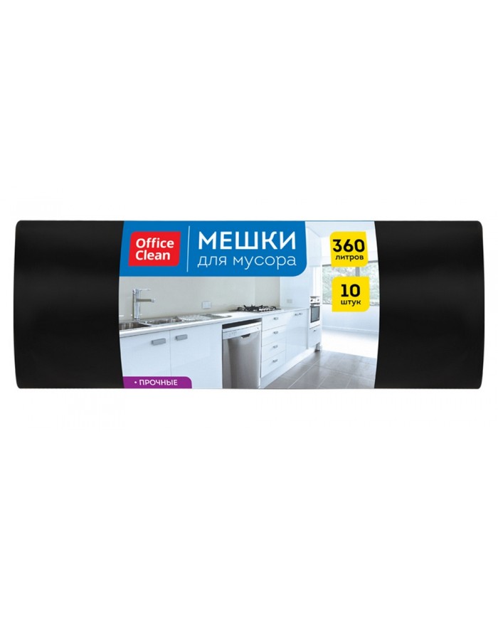 Мешки для мусора 360л OfficeClean ПВД, 110*140см, 60мкм, 10шт., прочные, черные, в рулоне