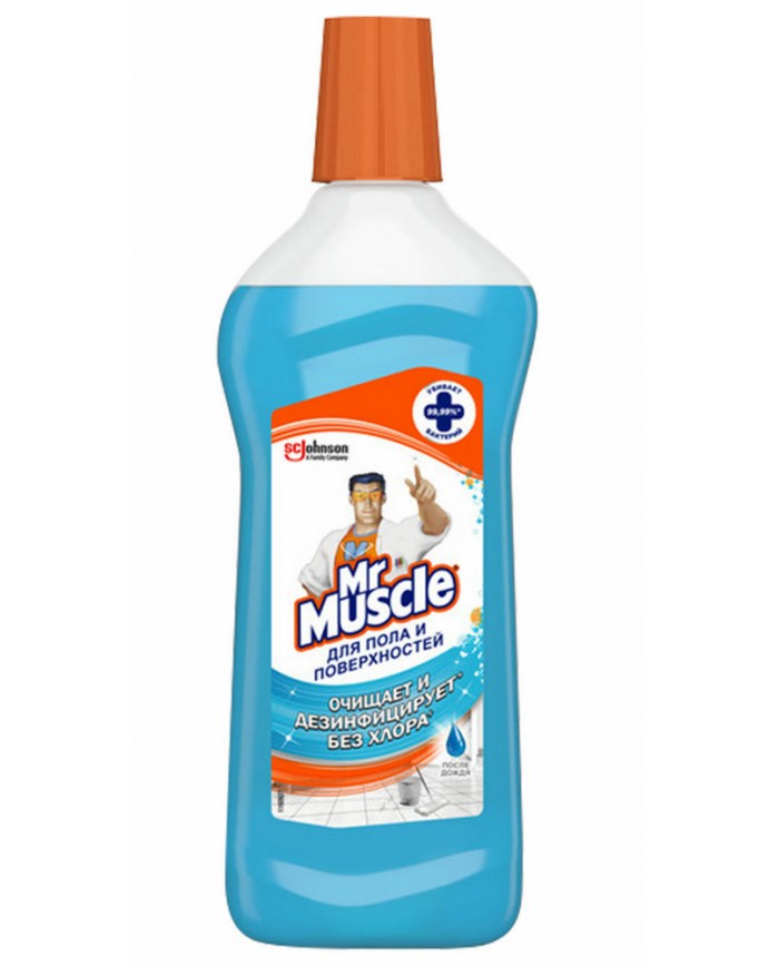 Средство для уборки дома МИСТЕР МУСКУЛ "После дождя" подходит для очищения и дезинфекции* напольных покрытий (плитка, ламинат, линолеум, пластик, керамогранит), плинтусов, раковин и других поверхностей. Идеальная чистота, свежесть и приятный аромат во всем доме. *Дезинфицирующий эффект в отношении исследованных микроорганизмов (E. coli, S aureus, S. typhimunium) достигается при экспозиции 5 мин. Не содержит активного хлора. При попадании в глаза вызывает выраженное раздражение. При попадании на кожу вызывает слабое раздражение. Вредно для водных организмов. Способ применения: для ежедневной уборки растворите 120 мл средства в 5 л теплой воды. Для мытья сильно загрязненных поверхностей и уничтожения микробов используйте неразбавленным. Нанесите на поверхность, оставьте на 5 минут, затем протрите влажной тряпочкой или губкой. Не используйте для поверхностей из необработанного дерева. Состав: вода, меньше 5%: н-ПАВ, отдушка (бутилфенилметилпропиональ, линалоол)**, алкил С12-16-диметилбензолметанаминийхлорид, консервант, красители. **потенциальные аллергены. Меры предосторожности: беречь от детей. При необходимости обратиться за медицинской помощью, по возможности показать маркировку продукта. Не смешивать с другими чистящими средствами. Не вдыхать пары средства. Использовать только в хорошо проветриваемых помещениях. Не допускать попадания в глаза, избегать продолжительного контакта с кожей. Использовать перчатки, средства защиты глаз. После применения тщательно вымыть руки. При попадании в глаза: осторожно промыть глаза водой в течение нескольких минут. Снять контактные линзы, если Вы ими пользуетесь и если это легко сделать. Продолжить промывание глаз. Если раздражение глаз не проходит/при возникновении раздражения кожи, обратиться за медицинской помощью. Избегать попадания в окружающую среду. Условия хранения: хранить при температуре от 0 °С до 30 °С в сухом, недоступном для детей и домашних животных месте, отдельно от пищевых продуктов. Срок годности: 2 года от даты изготовления.