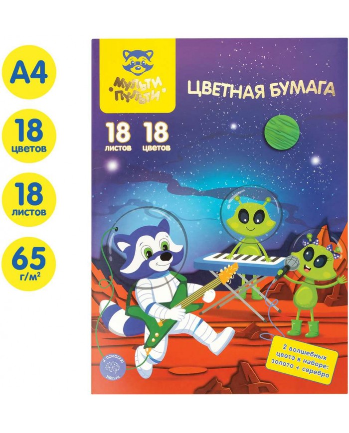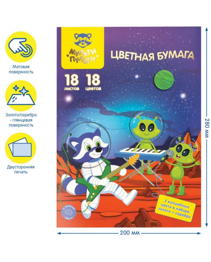 Набор цветной двусторонней офсетной бумаги «Мульти-Пульти» серии «Енот в космосе. Волшебная» замечательно подойдет для творчества. Бумага имеет размер 200*280 мм. Плотность бумаги формата А4 – 65 г/м2. В наборе представлено 18 цветов офсетной цветной бумаги на 18 листах, в том числе два листа серебряного и золотого цвета, что позволит создавать волшебные фантазийные поделки.