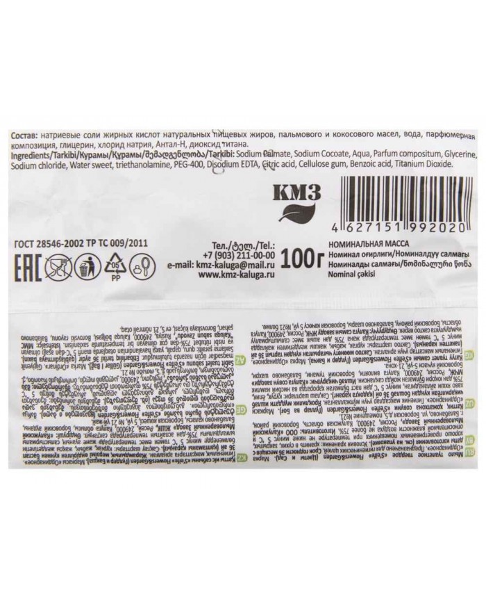 Состав: натриевые соли жирных кислот пищевых жиров, пальмового и кокосового масел, вода, парфюмерная композиция, глицерин, хлорид натрия, антал П-2, д..