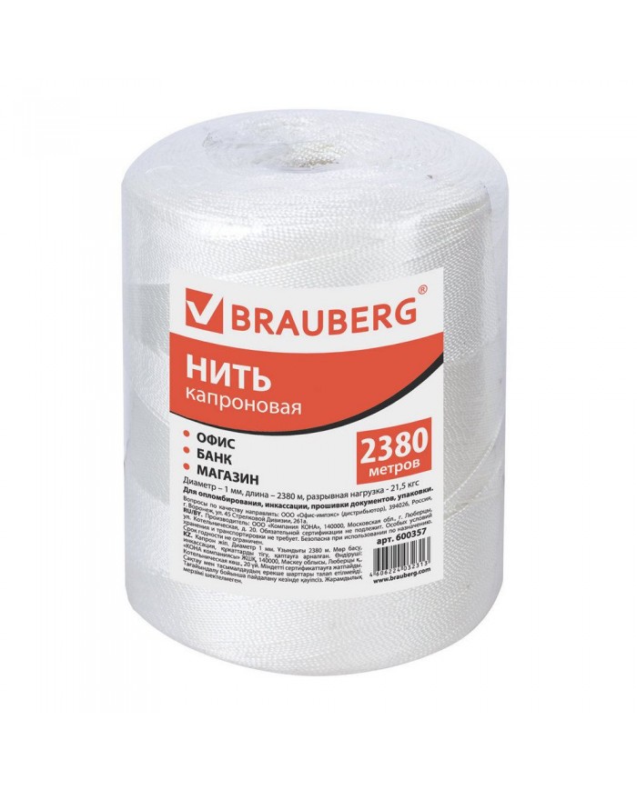 Нить капроновая (полиамидная) для прошивки документов, диаметр 1 мм, длина 2380 м, BRAUBERG,