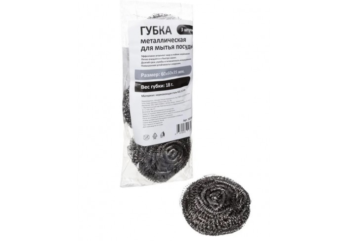Губка-мочалка для посуды металлическая 6x6 см 18 г (3 штуки в упаковке). Губка-мочалка предназначена для эффективной чистки кастрюль, чугунных сковоро..