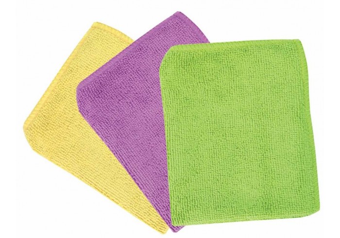 Изготовлены из микрофибры плотностью 180 г/м2. Размер - 30х30 см. Поставляются комплектом из трех штук в пакете с европодвесом. Преимущества микрофибр..